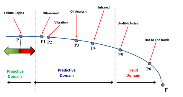 I-P-F Curve showing ultrasound as an early indicator of a potential problem in bearings and rotating equipment.